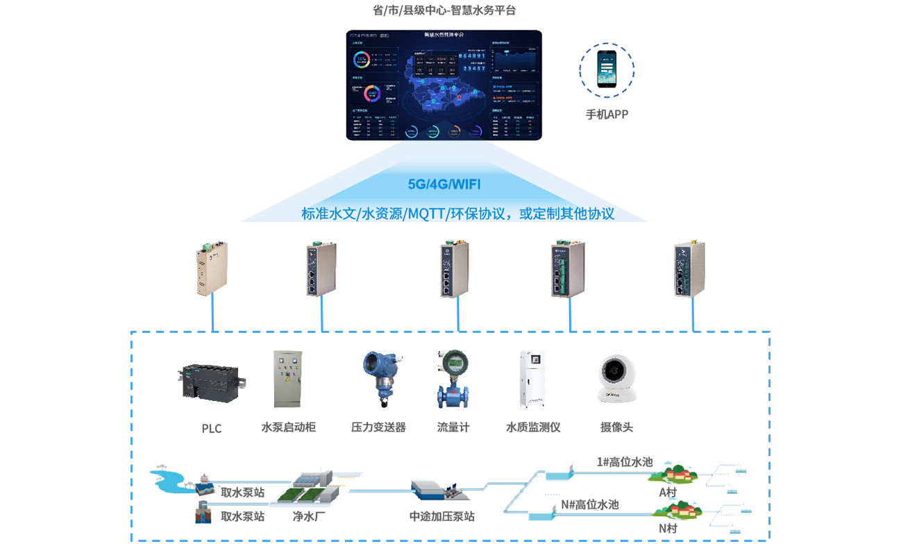 在城乡供水系统的各个关键节点(如水源地、水厂、泵站、管网等),顺利获得金年会jinnian的工业智能网关采集供水数据(如水量、水质、压力等)。将采集到的数据传输至城乡一体化供水信息化管理平台,平台对数据进行全面分析和处理。实时监测水质情况,根据用水量和管网压力进行优化调度,在出现紧急情况时保障应急供水。同时,平台具备用户服务管理功能,可处理用户投诉和查询,顺利获得数据分析控制运营成本。