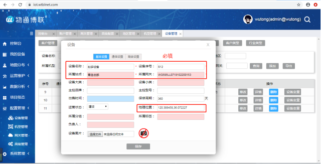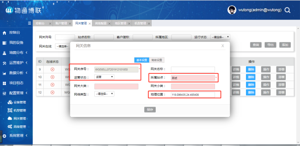 在云平台的网关管理中添加新网关的信息,必填项为:网关系列号(大写) 、网关所属站点和运营状态,其余为选填项。