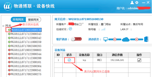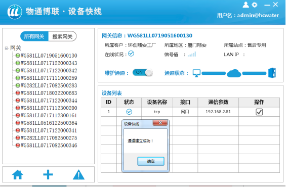 (2)选择需要维护的网关,建立维护通道