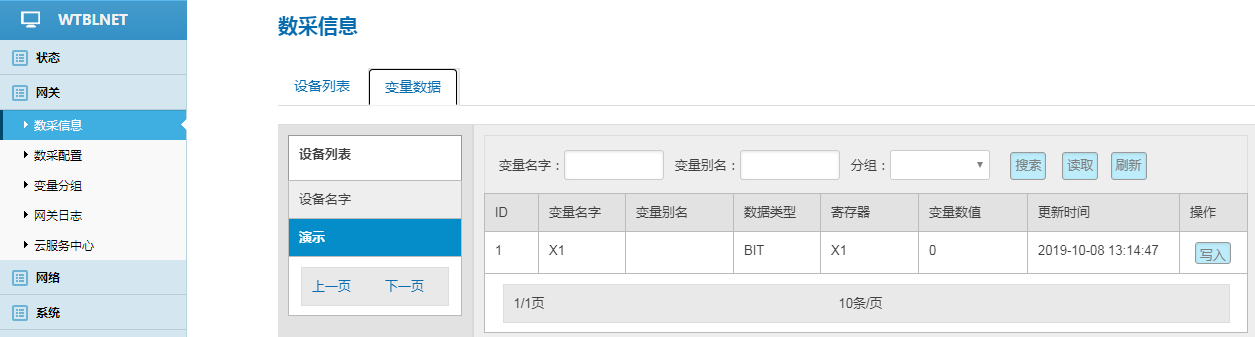 数采配置(设备信息+变量参数)完成后,重启采集程序并生效配置,即可在:数采信息---变量数据---设备名称 中看到采集上来的数据。