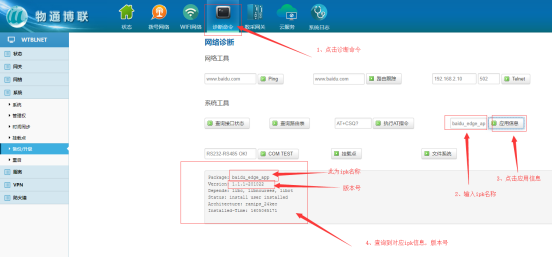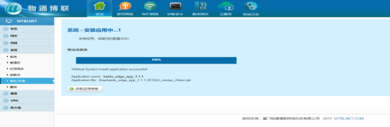 进入系统→备份升级,输入升级密码:wtbl1234567890@WideIOT.com ,然后选择对应要升级的ipk,最后点击安装,进度条显示100%即完成操作。