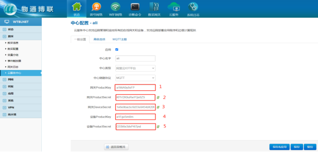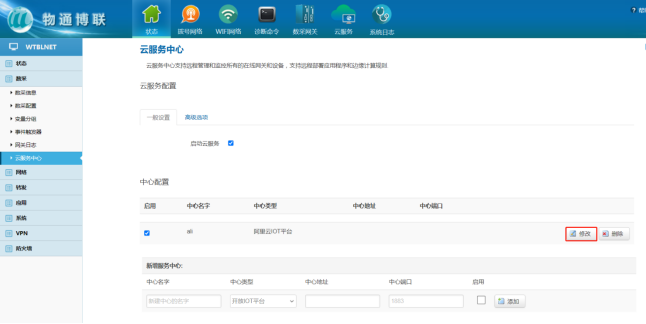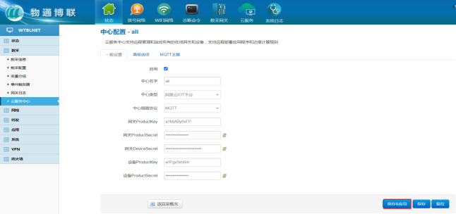 打开金年会jinnian网关WEB界面,可删除原有的服务中心,新建一个连接中心,中心类型选择阿里云IOT平台,启用√ 点击“添加” 保存应用
