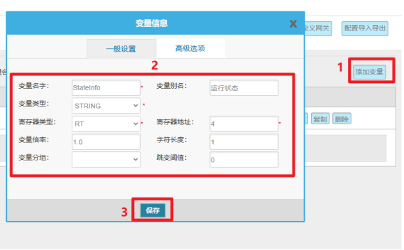 变量配置主要是定义变量名(自定义内容,不可使用中文命名)、变量别名(自定义,可使用中文名字)、寄存器类型和寄存器偏移地址,并定义一些数据规则(如:倍率、小数点、单位、告警)。