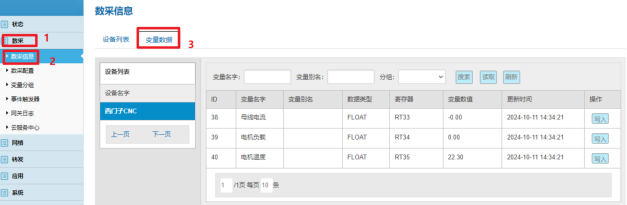 数采配置(设备信息+变量参数)完成后,重启采集程序并生效配置即可在:数采信息---变量数据---设备名称 中看到采集上来的数据。