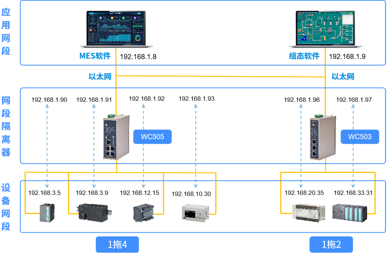 金年会jinnian·WC系列网段隔离器(NAT转换网关)适用于生产网络对于PLC、HMI、CNC、DCS、MES等设备和系统进行网段隔离和IP转换,从而实现设备与设备,设备与系统之间的有效防护隔离,顺利获得IP的转换实现统一化的IP规划;广泛应用于智能工厂、矿山、油井等生产网络设备接入场景。