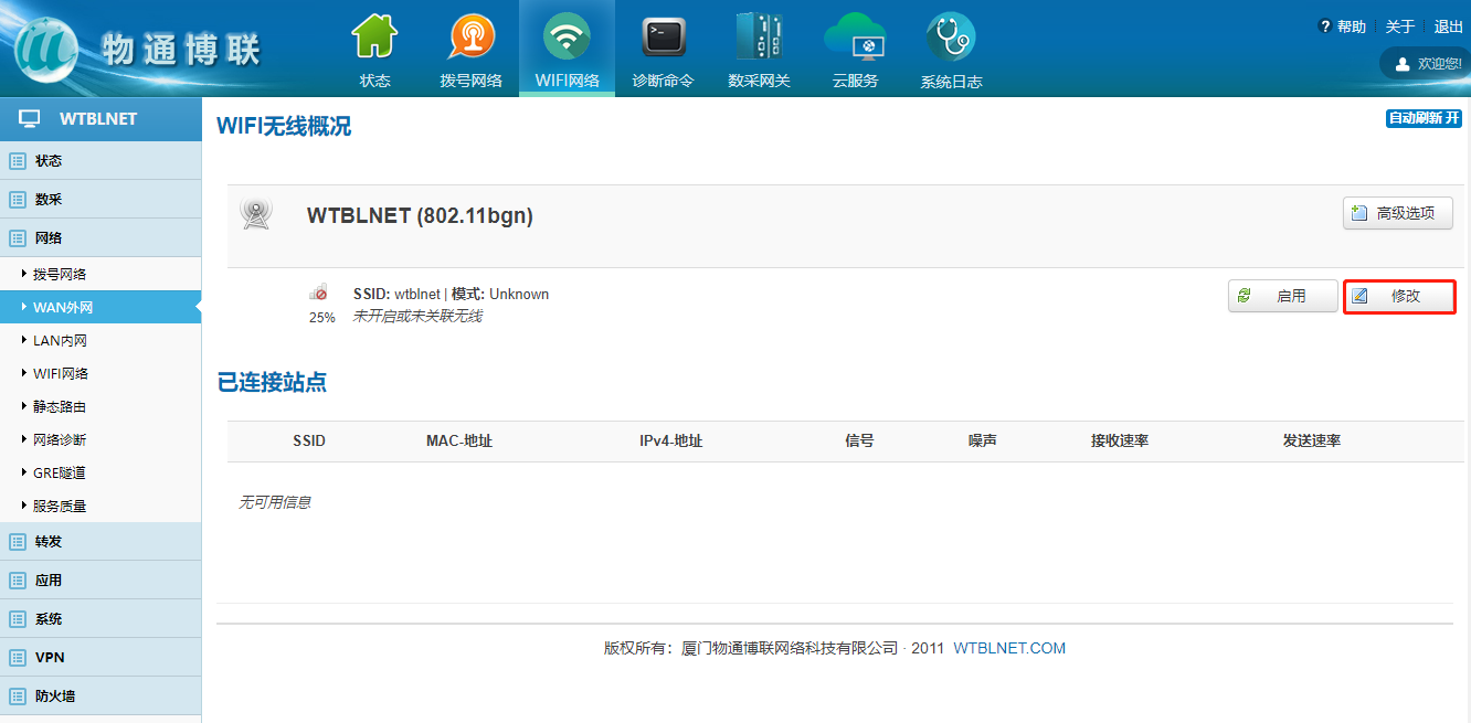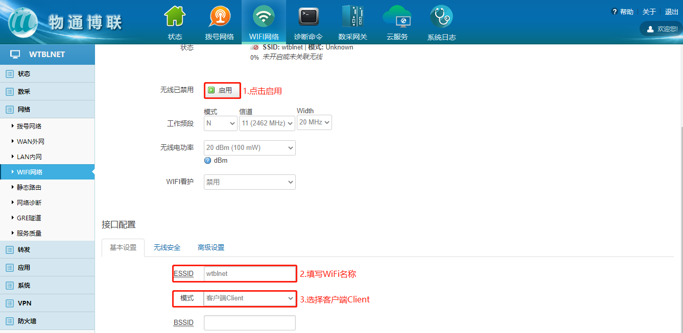 下载中心 视频中心 常见问题 售后服务 工业网关 设备快线 数据云平台 联网设备 问答百科 工业智能网关如何连接wifi热点? 时间:2022-10-26 09:15:30 点击:7921 关键词:工业智能网关,wifi 问题:工业智能网关如何连接wifi热点? 回答: (1)电脑顺利获得网线接入到网关LAN口,浏览器输入192.168.2.1默认地址 (2)登陆网关配置界面选择WiFi网络 (3)点击WiFi界面修改—进入WiFi配置界面 (4)启用WiFi—填写ESSID(WiFi名称)—模式选择客户端Client (5)点击无线安全—输入WiFi密码 注意:WiFi获取到的IP网段与网关LAN口的IP网段不能重复! 上一篇:工业智能网关如何更新程序和固件? 下一篇: 工业智能网关如何使用流量卡上网?