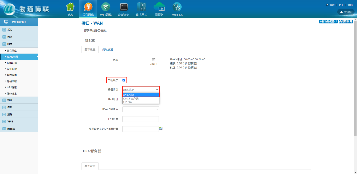下载中心 视频中心 常见问题 售后服务 工业网关 设备快线 数据云平台 联网设备 问答百科 工业智能网关如何设置静态固定IP? 时间:2022-10-26 09:15:30 点击:7622 关键词:工业智能网关,静态固定IP,网关配置 问题:工业智能网关如何设置静态固定IP? 回答: (1)WAN外网设置静态IP 网络—WAN外网—切换通信协议——填写固定IP参数 (2)WiFi网络设置静态IP 网络—WiFi网络—修改—切换通信协议—填写静态IP 上一篇:工业智能网关如何使用网线上网? 下一篇: 工业智能网关如何进行软硬件复位?