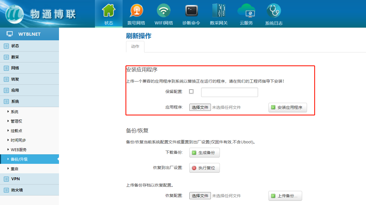 下载中心 视频中心 常见问题 售后服务 工业网关 设备快线 数据云平台 联网设备 问答百科 工业智能网关如何更新程序和固件? 时间:2022-10-26 09:39:53 点击:7806 关键词:工业智能网关,网关配置,固件升级 问题:工业智能网关如何更新程序和固件? 回答: (1)固件升级:后缀为。bin的文件 点击系统—备份/升级—选择文件—刷写程序(不保留配置) (2)IPK文件升级:后缀为。ipk的文件 点击系统—备份/升级—选择文件—输入密码—安装应用程序(不保留配置) 上一篇:工业智能网关时间如何进行同步? 下一篇: 工业智能网关如何连接wifi热点?
