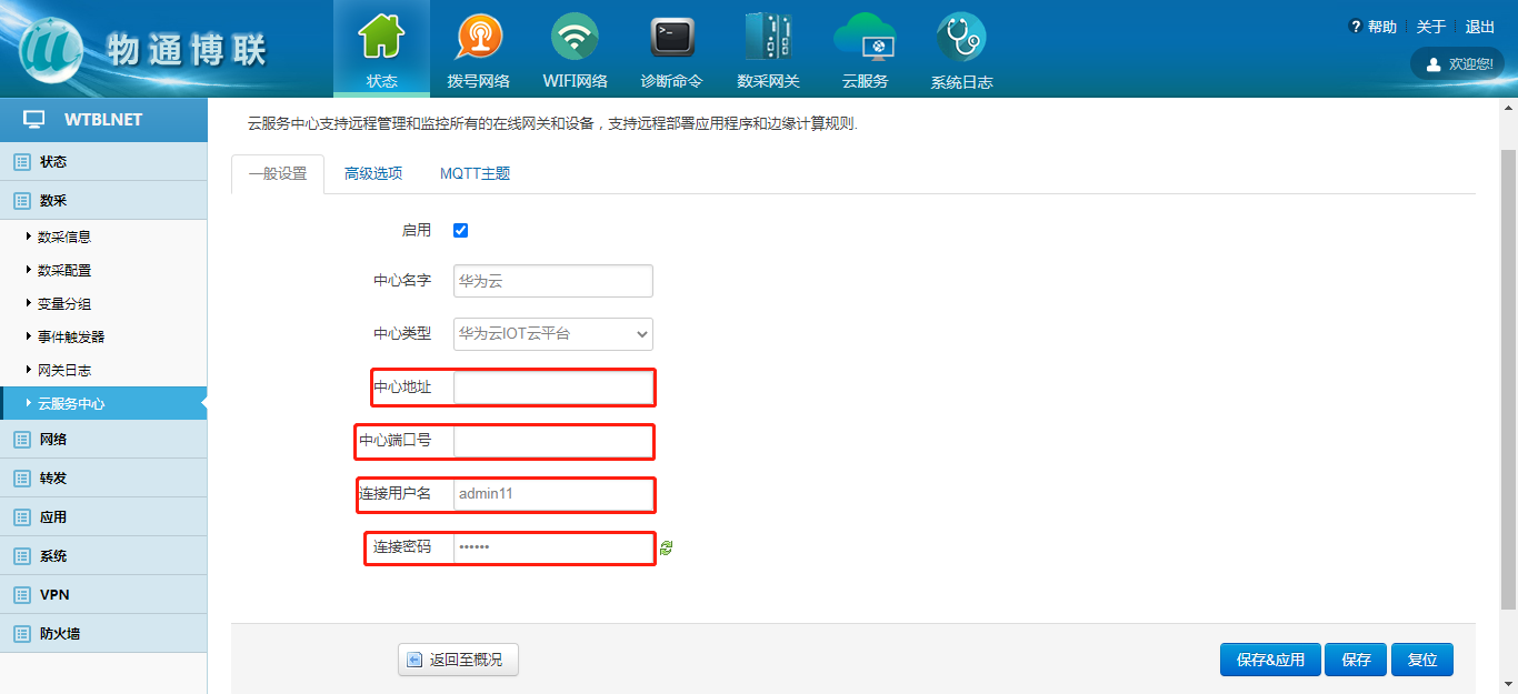 登录金年会jinnian工业网关配置界面,填写相关连接参数,配置内容,即可将数据上传至华为云IOT设备接入模型中(每种不同的第三方接入云,都有详细的配置手册)