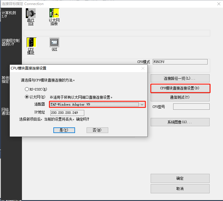 4、 CPU模块直连连接设置以太网适配适配器“TAP-Windows Adapter V9”。