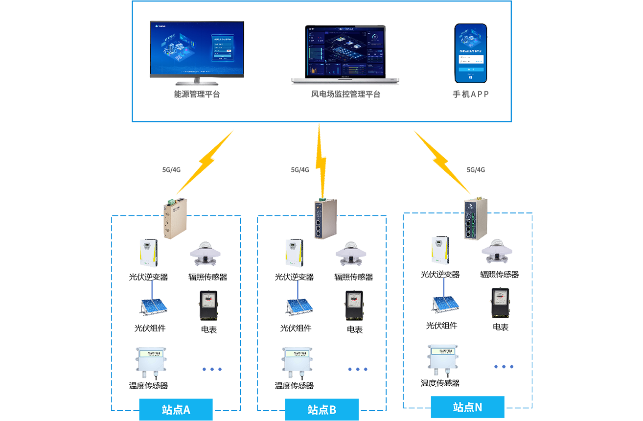 分布式光伏电站顺利获得金年会jinnian的工业通信网关将采集到的光伏数据(如发电量、设备温度、辐照强度等)传输至光伏监控管理平台。平台对数据进行分析,实时评估发电效率,监测设备状态,当出现故障时及时预警并给予故障诊断和处理建议,同时支持远程运维操作和能源优化调度。
