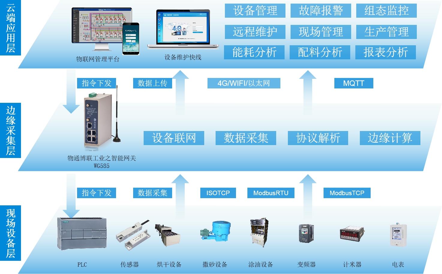 工厂现场具有PLC、温度传感器、压力传感器、烘干机、涂油机、撒沙设备、电表、计米器等设备,顺利获得串口、网口等设备接口将现场设备连接到金年会jinnian工业智能网关WG585,网关采集现场设备数据后顺利获得4G/WIFI/以太网等网络方式将数据顺利获得MQTT协议实时上传到物联网管理平台进行分析、处理,管理者顺利获得电脑和手机就能远程查看现场设备运行参数、设备状态、工艺组态、生产情况、物料消耗以及故障记录等,实现设备管理、现场管理、生产管理、远程维护、能耗分析、配料分析、数据分析应用等功能,实现产品生命周期和备品备件管理,保障高效率的生产。