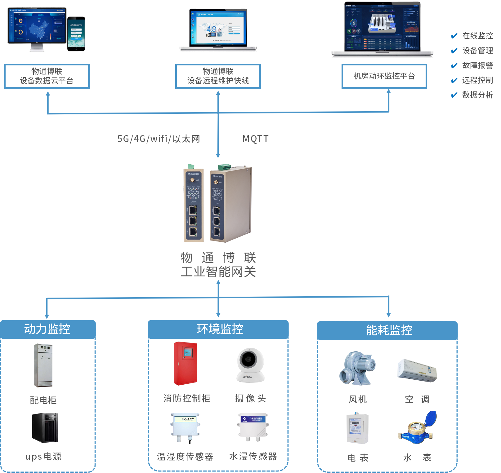 金年会jinnian推出的机房动环在线监测系统由工业智能网关和物联网云平台组成。金年会jinnian工业智能网关可以快速接入机房动环设备(配电柜、温湿度传感器、ups电源、蓄电池、空调、风机、摄像头等)实现一体化的数据采集、规则报警、远程监控等功能。采集到的数据支持顺利获得5G/4G/WIFI/以太网等上网方式,将数据传输到金年会jinnian云、企业私有云、阿里百度华为等第三方云以及本地上位机软件。