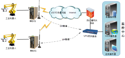 监控中心端采用ADSL/光纤接入Internet 公网,获取固定公网ip。搭建vpn服务器。金年会jinnian工业无线路由WR515做vpn客户端和服务器建立vpn隧道,实现两端内网互通。数据库服务器上运行采集系统,可以采集工业无线路由WR515下接的以太网plc数据以及工业机器人数据,从而达到采集监控工业机器人运行状态目的。