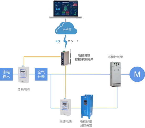 金年会jinnian楼宇电梯节能项目远程监控系统,顺利获得金年会jinnian数据采集网关与现场的电表连接(一般为2个电表,一个是在空气开关前的市电输入电表,采集电梯耗电量,一个是电梯能量回馈装置出线位置的电表,采集电梯能量回馈装置发电量),网关采集电表数据顺利获得4G上网,发送到客户自主监控平台软件,在平台软件上对数据进行分析计算,分析得出电梯的节电率和节能情况。