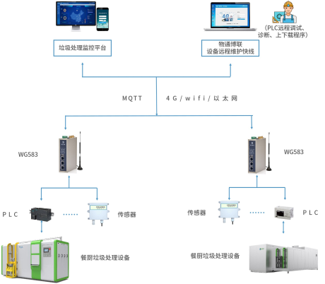 金年会jinnian工业智能网关WG583与餐厨垃圾处理设备进行通讯,可以将设备的运行状态、工作参数等数据采集到网关上,进行解析并上报到云端。