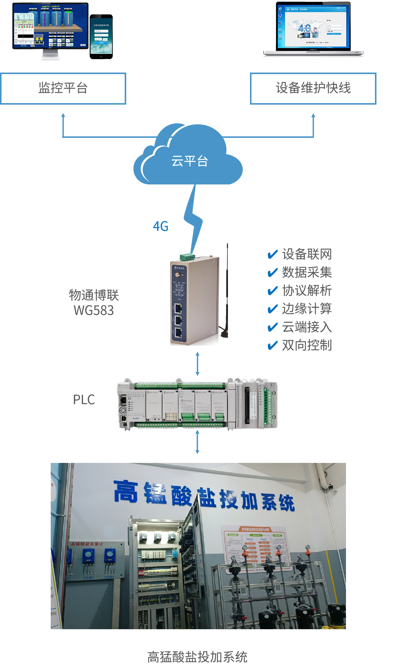 顺利获得采集AB PLC并将数据发送至云平台,可以实现对高锰酸盐投加系统的远程监控,管理人员可以顺利获得手机或电脑远程访问整个系统。